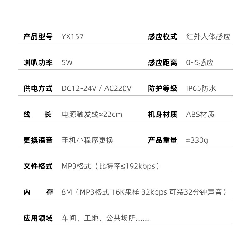 YX157ÈËÌå¸ÐÓ¦Îü¶¥ÌáÐÑÆ÷ÊǽÓÄÉʨ×Ó»áµç×ÓÖÇÄÜMP3ÒôÀÖ²¥·ÅоƬΪ´¦Àí½¹µã£¬£¬FLASHоƬΪ´æ´¢Æ÷¿ª·¢µÄÓïÒô²¥·ÅÆ÷²Ä¡£Ëü¿ÉÓÃÓÚµçÁ¦ÏµÍ³·¢µç³§¡¢¾üʹÜÖÆ¡¢¹«°²¾¯½äÇø¡¢Ïû·ÀͨµÀ¡¢ÓªÒµÌüÍøµã£¬£¬µçÌÝ£¬£¬×Ô¶¯·öÌÝºÍÆäËüÐèÒªÌáÐÑÓйØÖ°Ô±×¢ÖصÄÇå¾²Ìá·ÀÇøÓò£¬£¬»òÕß½Ó´ý¿ÍÈ˵½À´µÄÓïÒôÌáÐÑ¡£µ±Õì̽Æ÷̽²âµ½ÓÐÈ˽øÈë¸ÃÇøÓòʱ£¬£¬»á×Ô¶¯¸ÐÓ¦²¥±¨ÓïÒôÐÅÏ¢